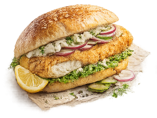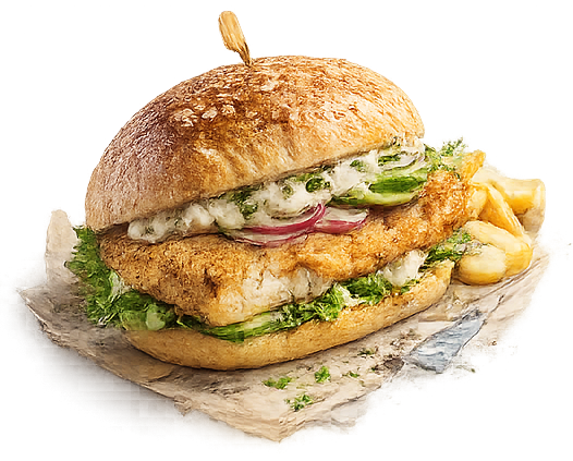 Saftiges Fischfilet im Burgerbun mit frischen Zutaten und unseren eigenen Gewürzmischungen und Saucen.
