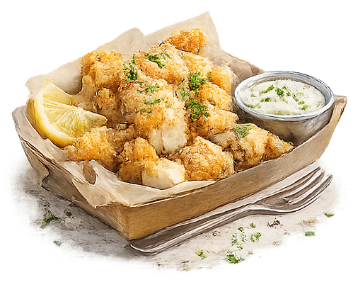 Saftiger Fisch aus nachhaltiger Zucht, umhüllt von unserer hausgemachten knusprigen Panade – frisch frittiert und mit unseren eigenen Saucen serviert.